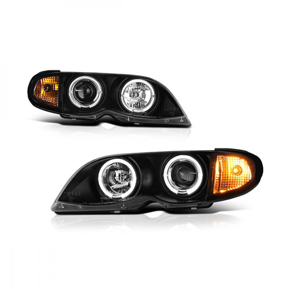 BMW 3 Serisi E46 kasa araçlarla uyumlu, çift Angel Eye (halka) aydınlatmalı ve siyah iç tabanlı modifiye far setidir. Sportif görünüm için karartılmış zemin tasarımına sahiptir ve üzerinde entegre turuncu sinyal üniteleri ile gece görüşünü optimize eden odaklayıcı mercek yapısı bulunur.