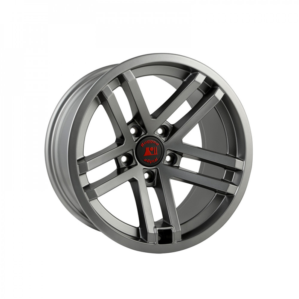 4x4 ve arazi araçları için tasarlanmış, darbelere dayanıklı, beş kollu modern mat gri bitişli off-road jantı.