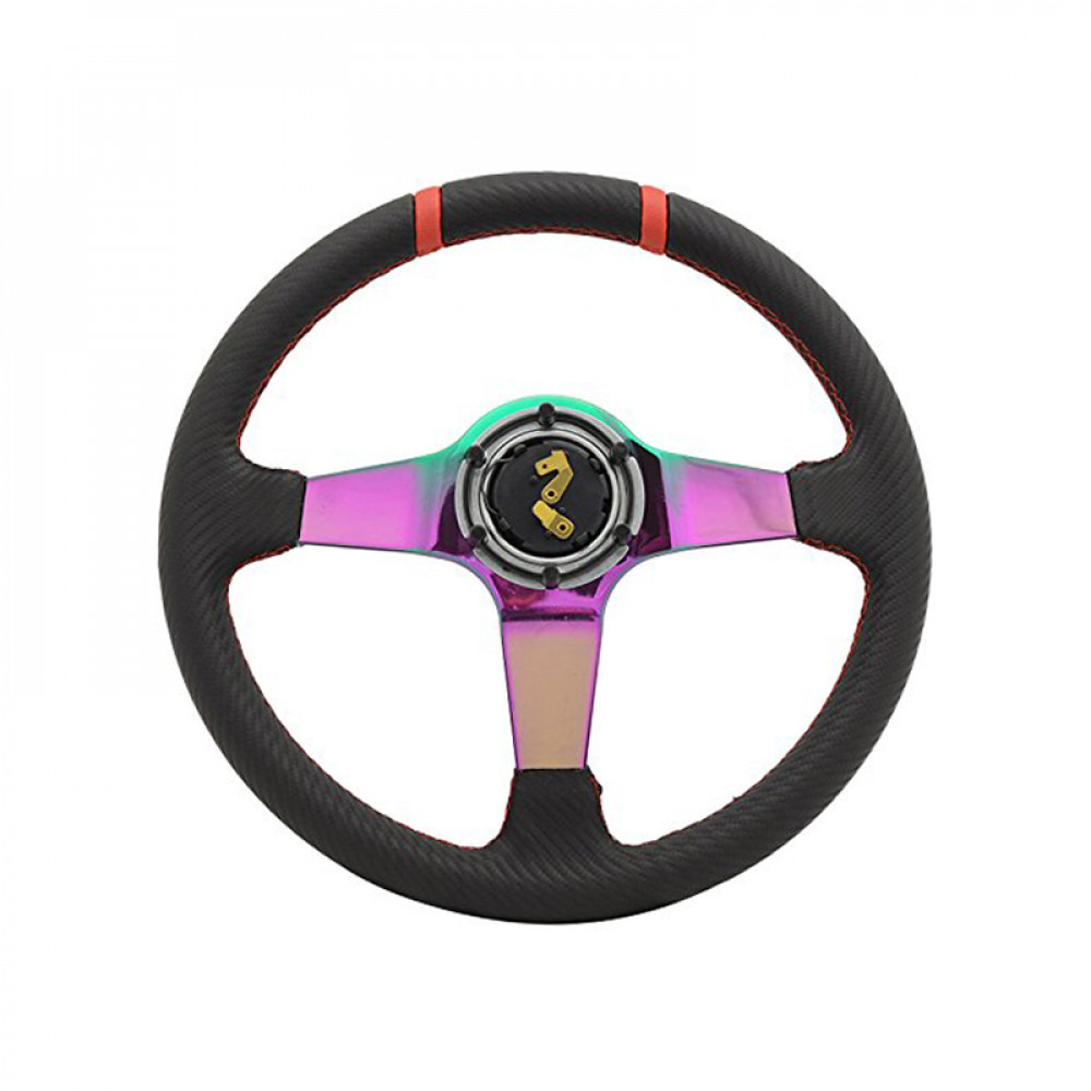 Karbon fiber detaylı dış kaplamaya ve gökkuşağı efektli (neo-chrome) orta göbeğe sahip, sportif sürüş odaklı modifiye direksiyon.